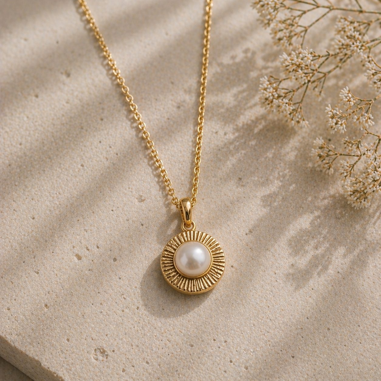 A single freshwater pearl set into a softly textured sunburst bezel, hung on a fine 14k gold-fill chain. Designed to sit quietly at the collarbone and layer naturally with finer chains.